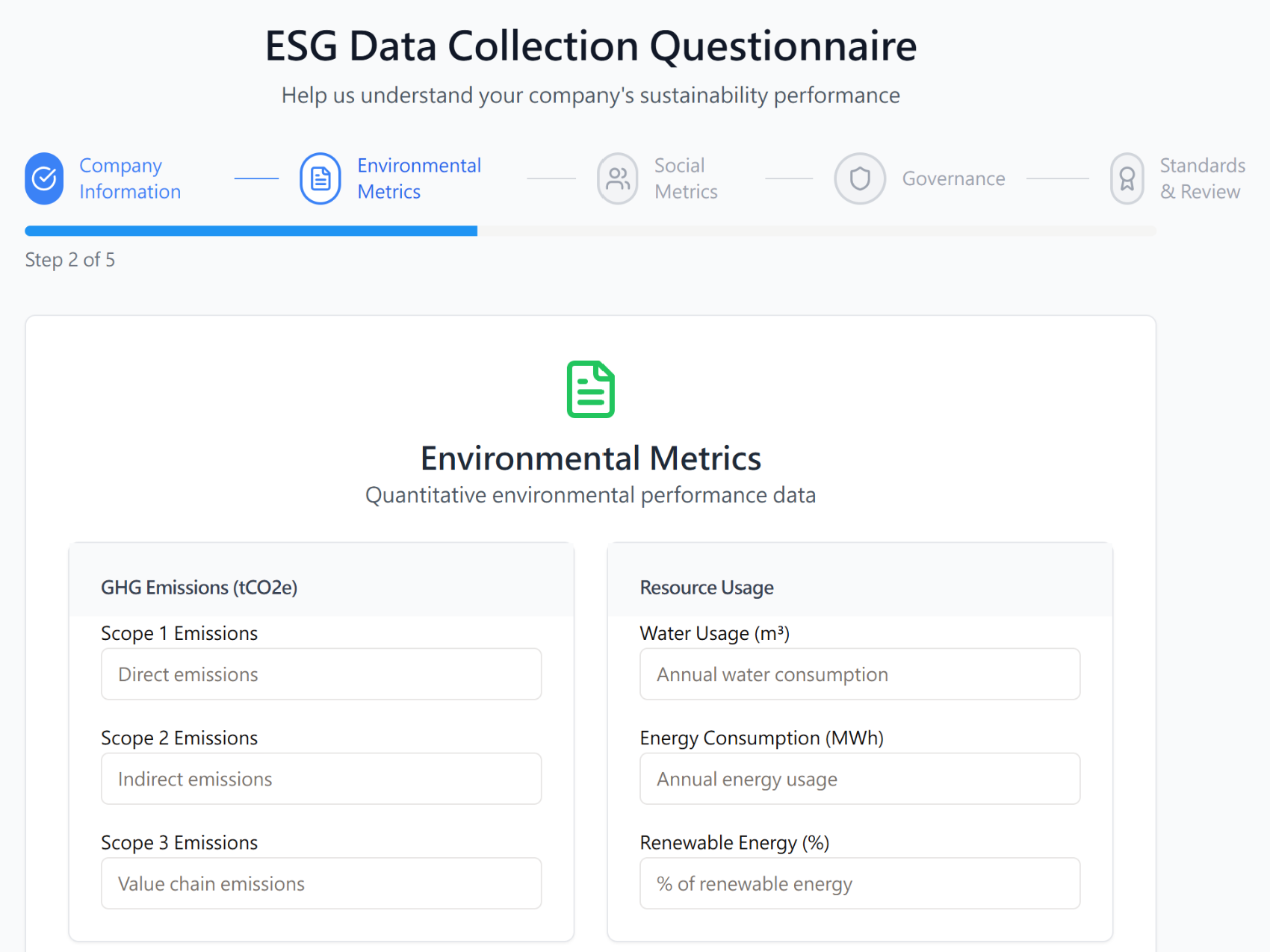We ingest quantitative metrics (e.g., GHG emissions, water usage) and qualitative inputs (e.g., governance structure, certifications) from your fund and portfolio companies.
